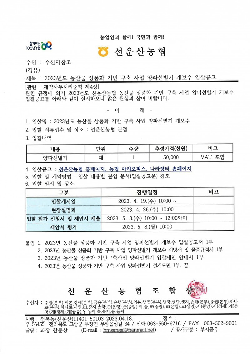 2023년도 농산물 상품화 기반 구축 사업 양파선별기 개보수 입찰공고